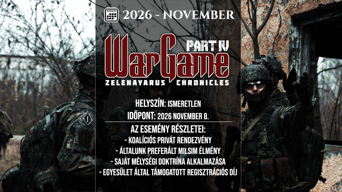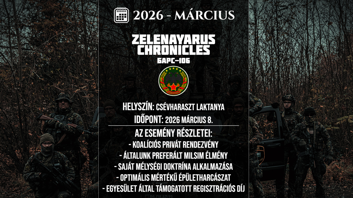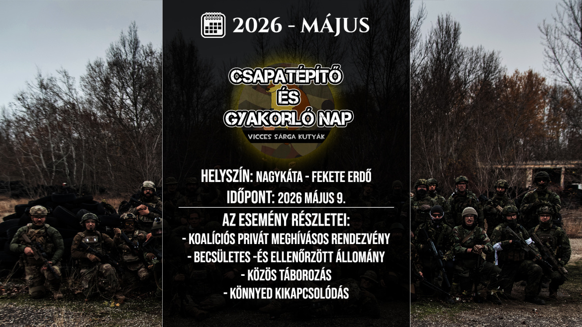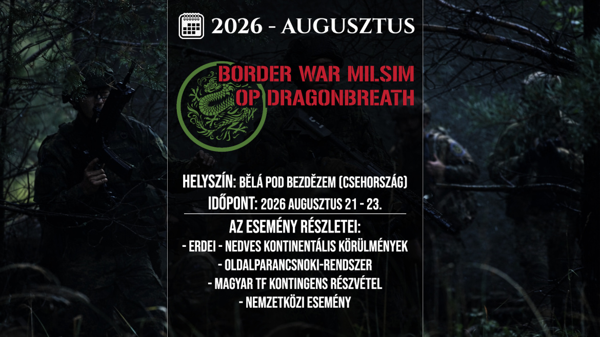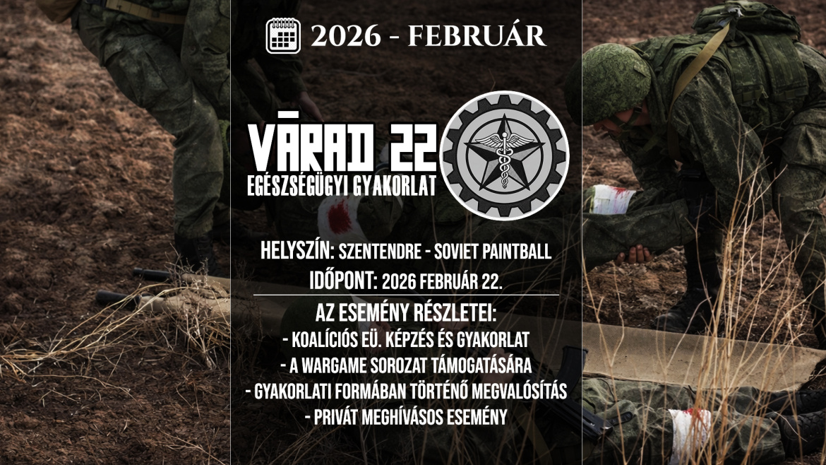 | ● 2026.02.22. Vasárnap ● VÁRAD22 EÜ. Gyakorlat és játék | ● 2026.03.08. Vasárnap ● WarGame BARSZ106 ● 2026.03.20. Péntek ● Serenissima Patrol Competition IV. (IT) ● 2026.03.28. Szombat ● MILSIM 2026 |